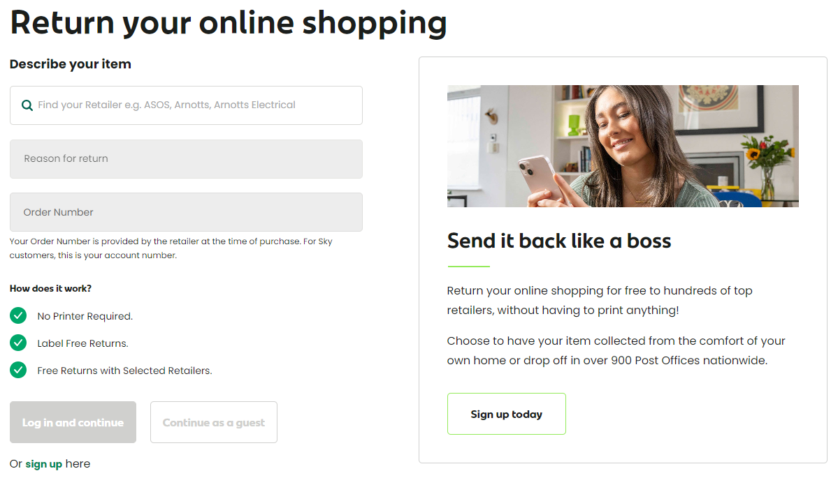 - Pop the information requested into the boxes and either log in if you have an Anpost account or continue as a guest.