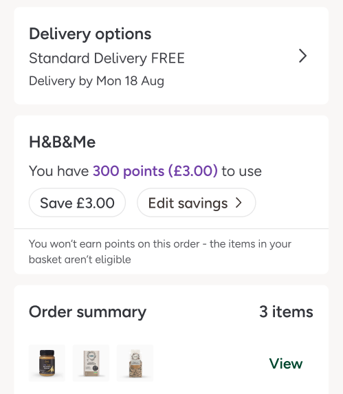 - If you choose edit savings, you can choose how many points you’d like to spend (in 50p increments) and apply them to your order, for example if you have 300 points but only want to spend 200.