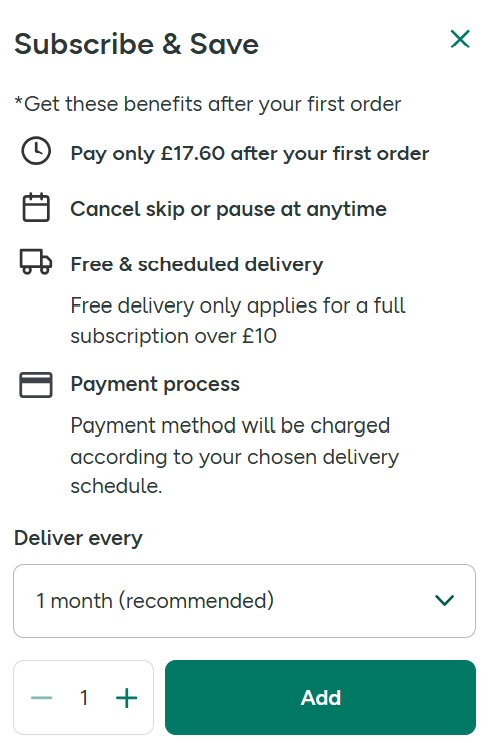 - Select Your Product: Find the product you wish to subscribe to on our website and click on the 'Subscribe & Save' option. Choose your preferred delivery frequency and 'add' the item to your basket. You'll see the subscription price that you'll be paying from your second order onwards.